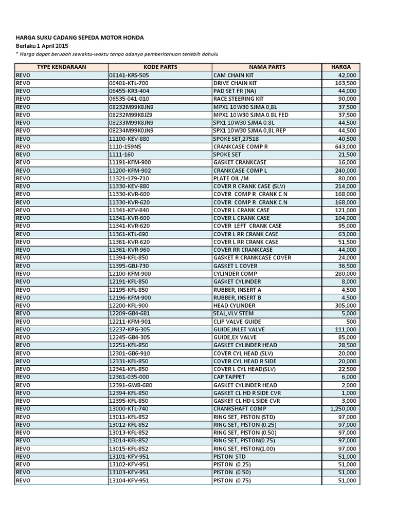 Berikut pricelist daftar harga onderdil motor Honda update terbaru bulan Juli Tahun 2018 per set pcs maupun satuan. Lihat harga Honda Revo 2021 spesifikasi fitur warna konsumsi BBM review redaksi oto. Bandingkan juga Revo 2021 dengan.