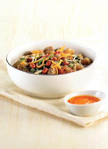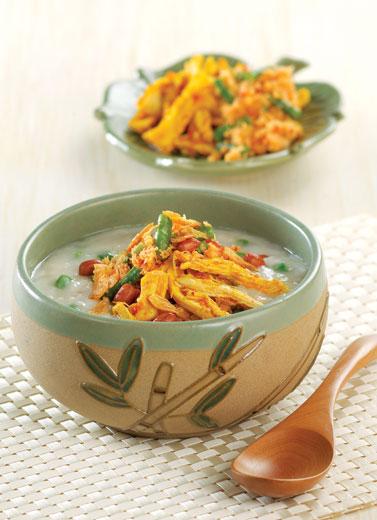 Masak sambil diaduk terus sampai menjadi bubur. Angkat daging ayam saring kaldunya. Bubur ayam merupakan makanan yang sehat.